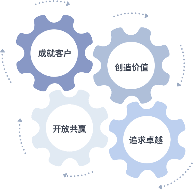 成就客户是一切决策的出发点,,,,创造价值是衡量所有工作的标准,,,,追求卓越是我们做事做人的态度,,开放共赢是我们的格局也是最终的结果。。。价值观的齿轮环环相扣,,,推动着组织里的每个人不断向前。。。