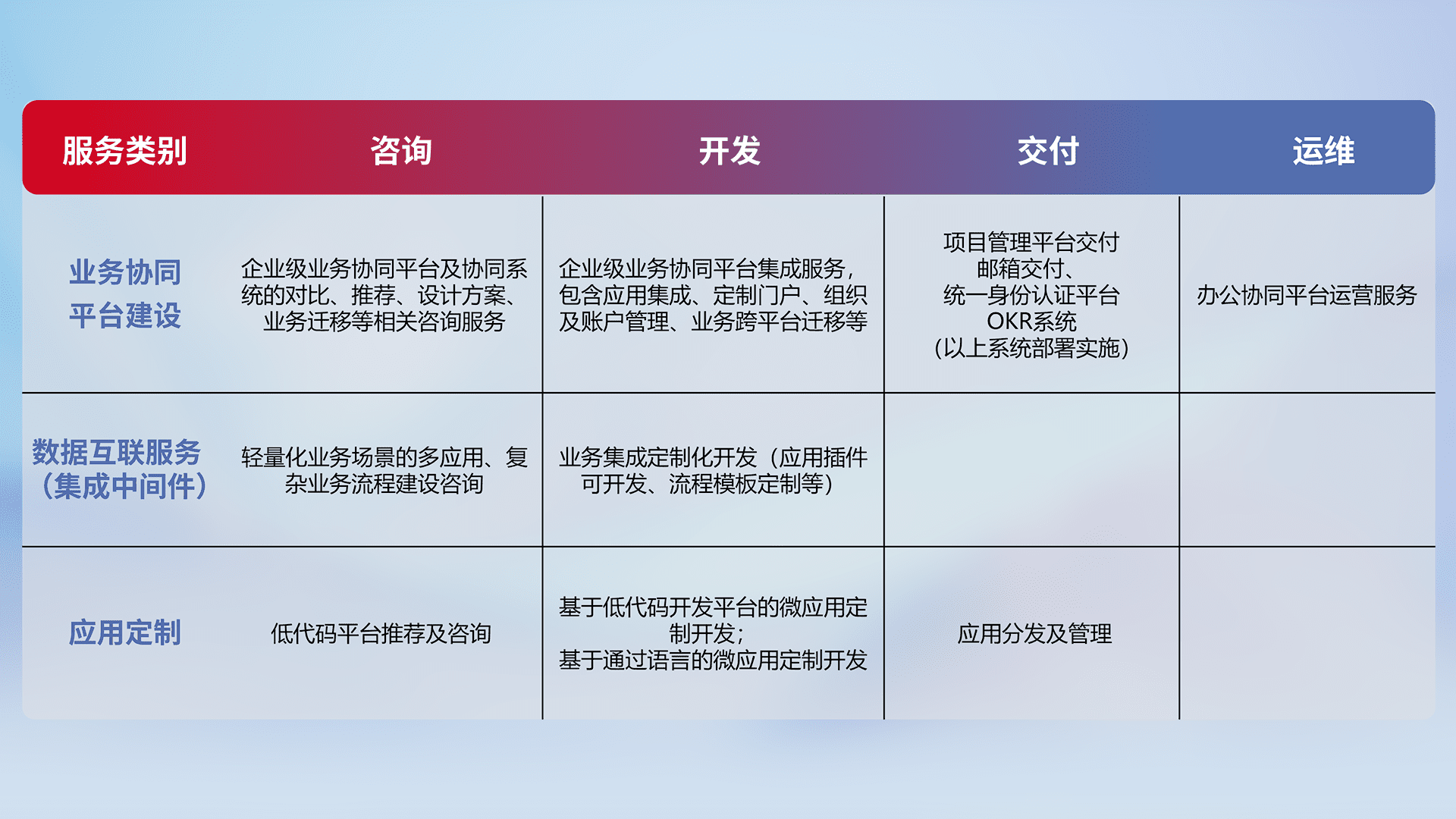 针对钉钉、、企微、、、IDaas等平台级产品提供产品的规划、、方案、、、交付、、、、定制化开发等服务,,实现如统一协同办公、、、智能客户服务、、、混合会议管理、、智能数据查询、、等业务场景,,,,实现数字化转型。。。